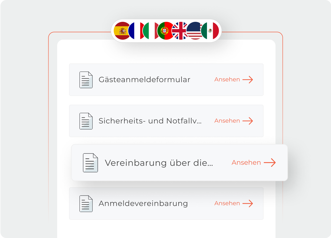 Automatisieren Sie die Erstellung von Verträgen, lokalen Registrierungsformularen und polizeilichen Meldebögen mit Gästedaten – angepasst an Ihre Region.