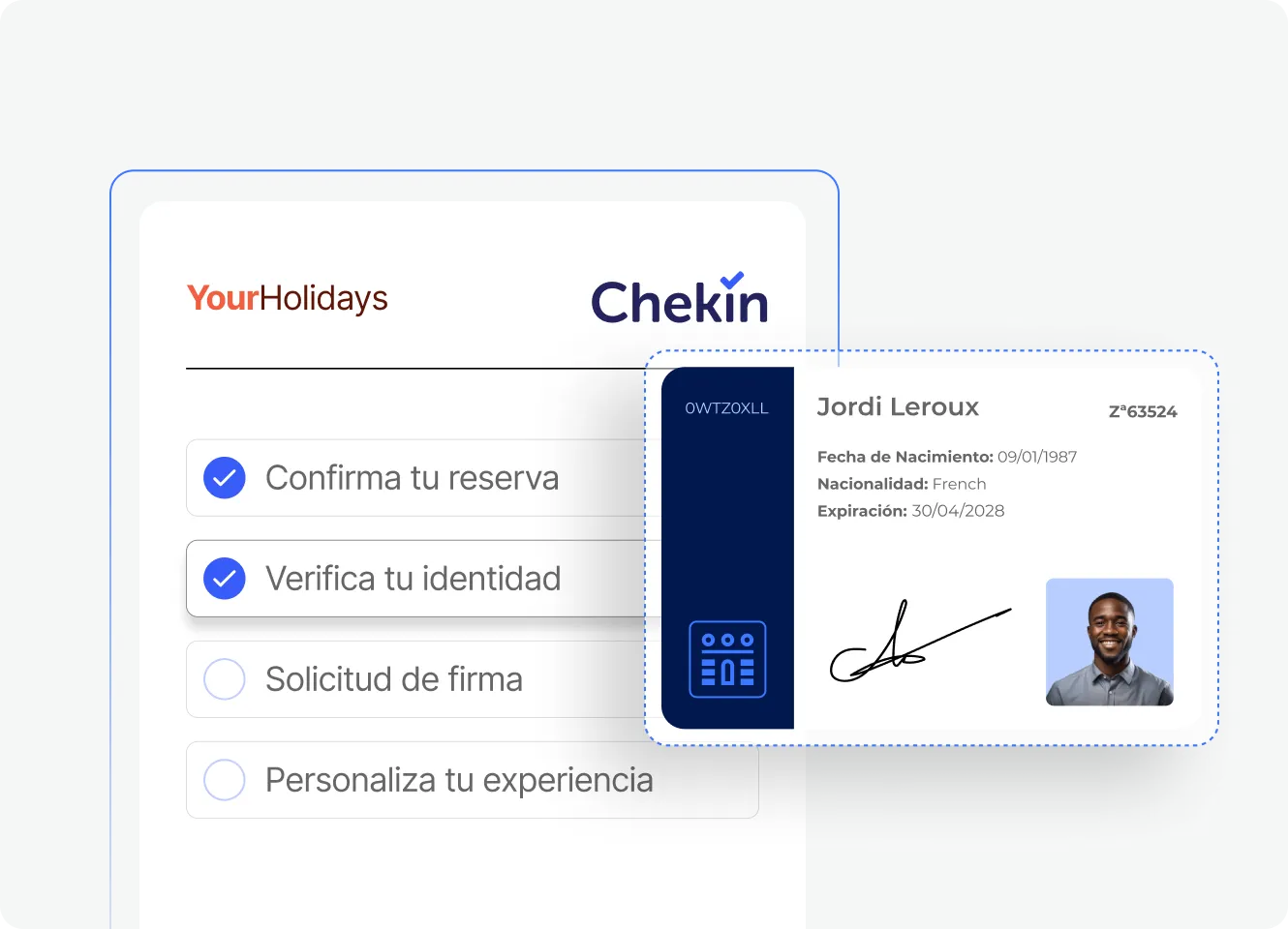 Automatiza la recogida segura y almacenamiento legal de datos de huéspedes y recopila firmas digitales. Con el plan powered by Chekin, añade verificación de identidad completa con DNI + selfie.
