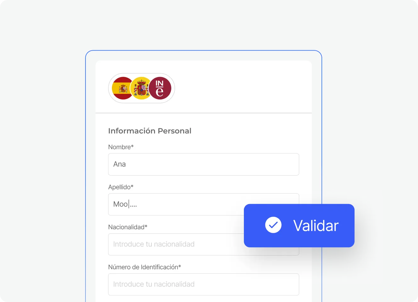 El huésped introduce sus datos, sube su documentación y completa la verificación de identidad mediante selfie: todo desde tu web, sin aplicaciones. El formato y la completitud de los datos se validan automáticamente.