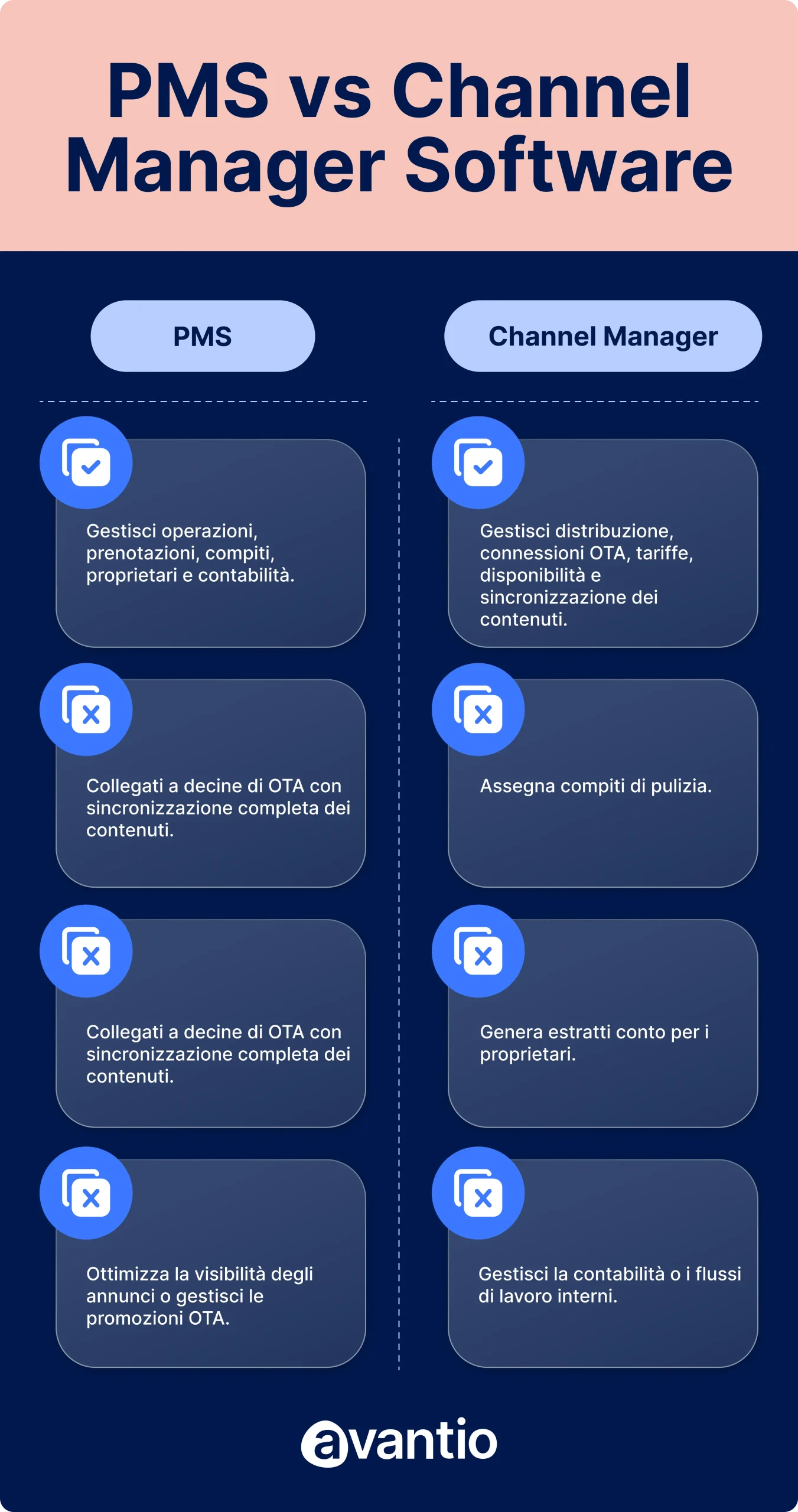 Scegli in base alla tua configurazione: PMS per flussi di lavoro interni, Channel Manager per prenotazioni basate su OTA o entrambi per scalare tra proprietari e destinazioni.